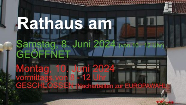 Aufgrund der Nacharbeiten für die Europawahl bleibt das Rathaus am Montag, den 10.06.2024, vormittags für den Publikumsverkehr geschlossen.